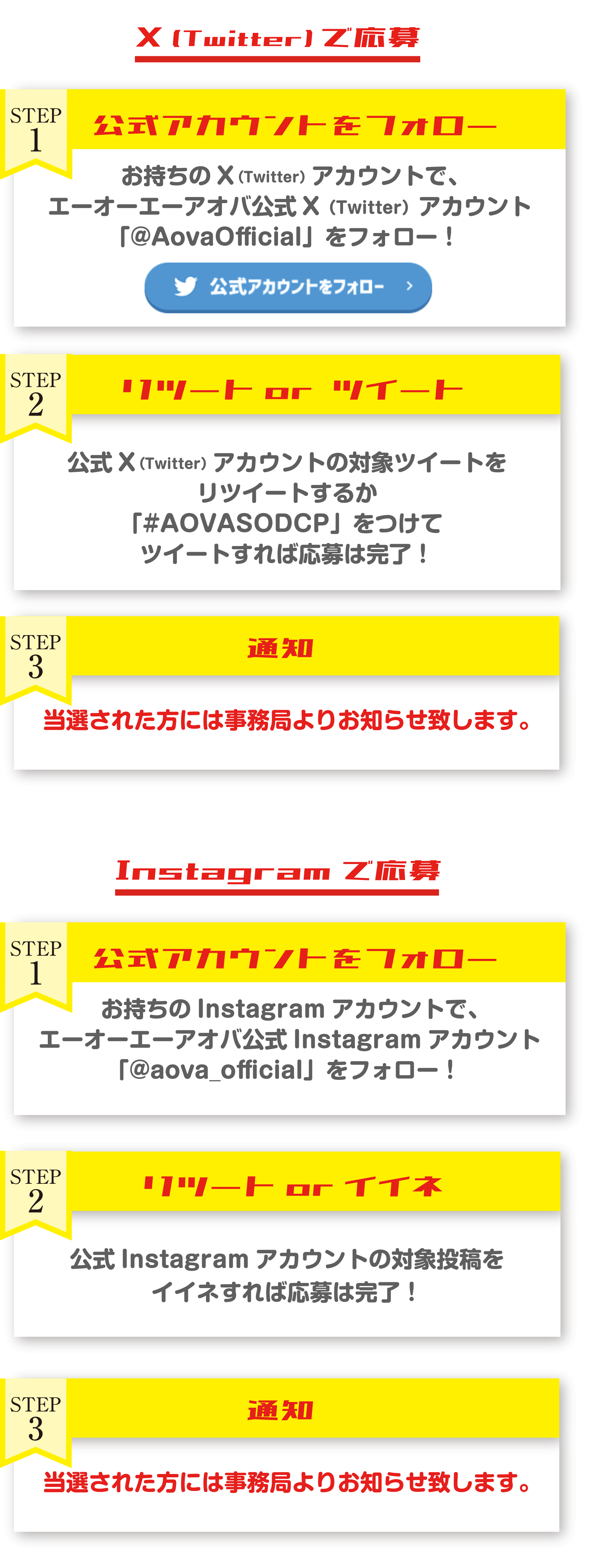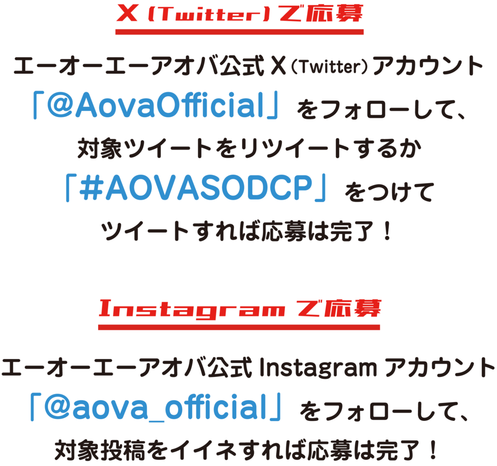 - キャンペーンの参加にはエーオーエーアオバ公式X(Twitter)アカウント「@AovaOfficial」・エーオーエーアオバ公式Instagram「@aova_official」をフォローしていただく必要がございます。